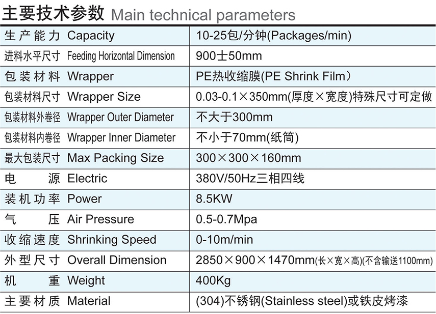 本產品適用于裝盒機紙盒出來后集盒包裝,是用PE膜進行袖口式熱收縮包裝。包裝方式有:單排包裝、前后排包裝、上下排包裝。進料包裝時可自動完成物品堆疊方式、輸送到位、自動將包裝膜輸送、進行自動切封膜、然后收縮等功能;本設備是人機界面PLC控制,光電跟蹤、變頻調速;運行中出現異常能自動顯示故障原因,及時排除故障。該機可單獨使用,亦可與裝盒機連接成自動生產聯動線。